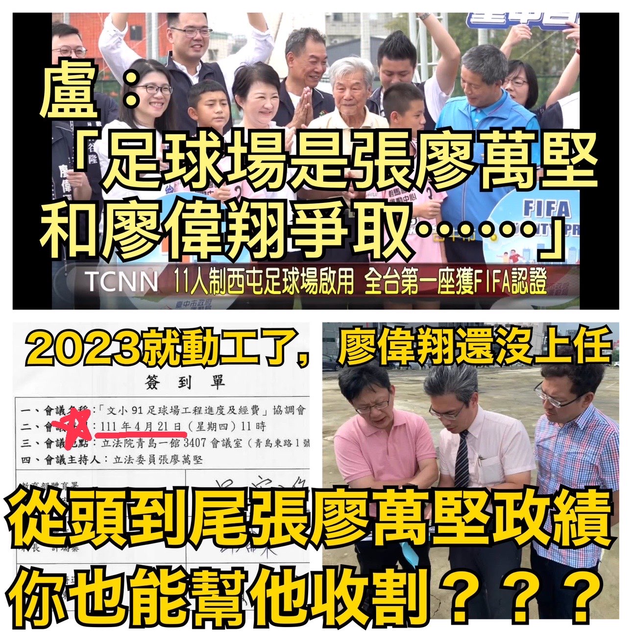 - 111年4月21號,張廖萬堅在立法院委員會招開【文小91足球場工程進度及經費】協調會等的付出,2023年就動工,然後廖偉翔在2025年1月31號的啟用11人制的西屯足球場典禮時,被盧秀燕收割給廖偉翔。