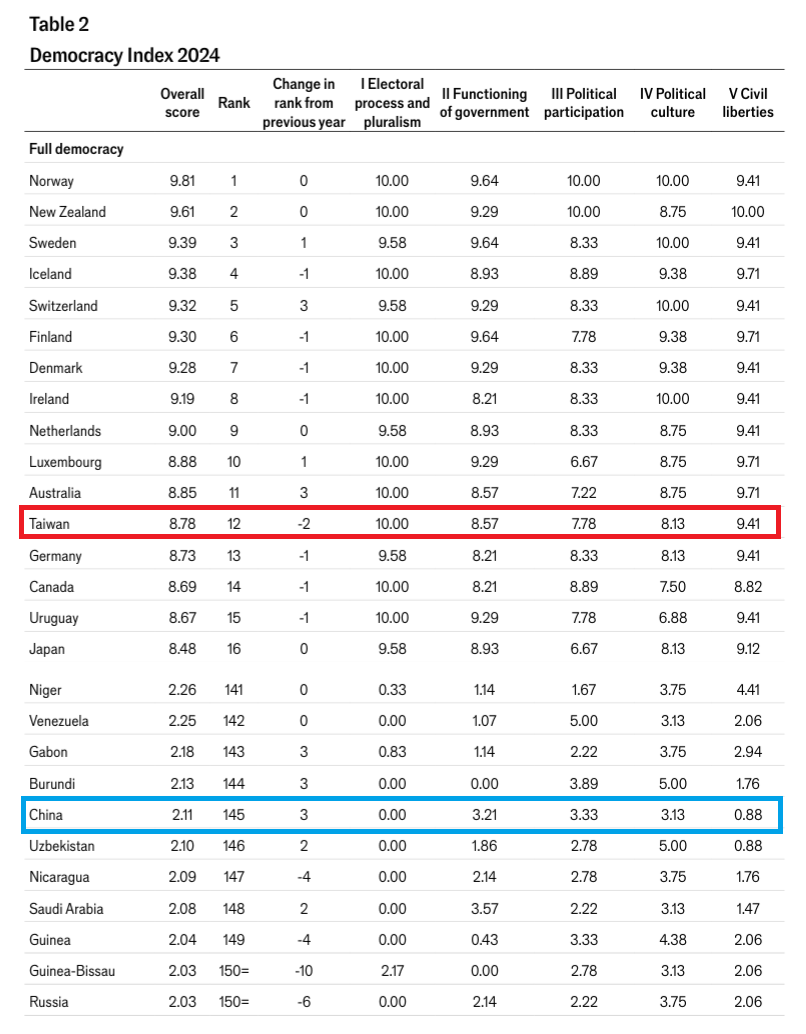 2024年經濟學人雜誌評比中,台灣的民主程度排名前12名